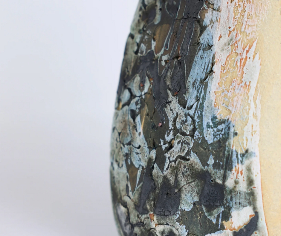 Karen Alexander’s ceramic practice is grounded in process. She often uses handbuilding methods – press mould and slab techniques – to create the walls of her ceramic pieces. Layers of clay are built up, adding both strength and texture. The forms are then gently paddled, a subtle process that creates a vibration in the work, giving it a sense of life and movement.